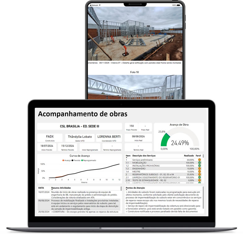 - Progresso da obra (efetivo, materiais, logística)